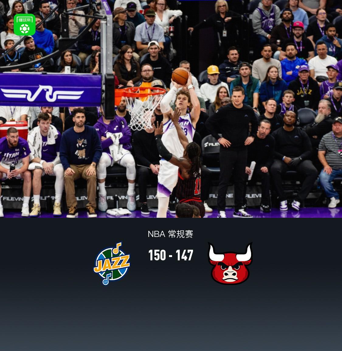 加时赛爵士基扬特-乔治拿下12分,公牛科比-怀特拿下8分,最终爵士150-147战胜公牛